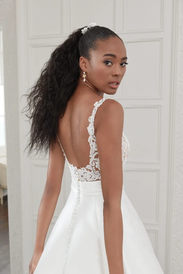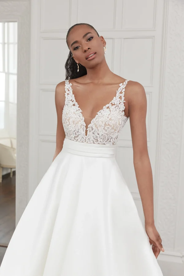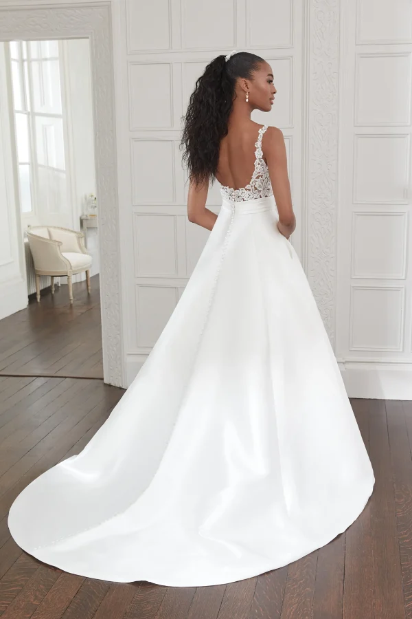 Fit for the modern fairytale bride, this charming Mikado ball gown will leave a lasting impression. With a plunging V-neckline and square back, the bodice is embellished with tonal beaded lace appliqués that create subtle sparkle. A Mikado cummerbund defines the natural waist and leads to a classic full skirt with pockets. The bridal gown is finished with a blend of Mikado and diamond shaped buttons cascading to the end of the chapel length train.